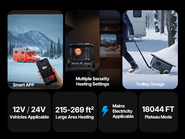 Szeroka kompatybilność: Nasze ogrzewanie postojowe na olej napędowy jest kompatybilne z kamperami, ciężarówkami, SUV-ami i innymi pojazdami. Działa na prąd stały 12 V/24 V lub przemienny. Tryb wysokościowy obsługuje wysokości od 3000 do 5550 m (9842–18044 stóp) podczas podróży zimowych i codziennego użytku.
