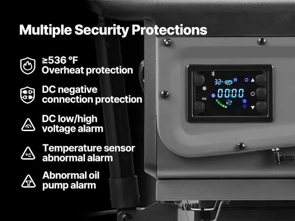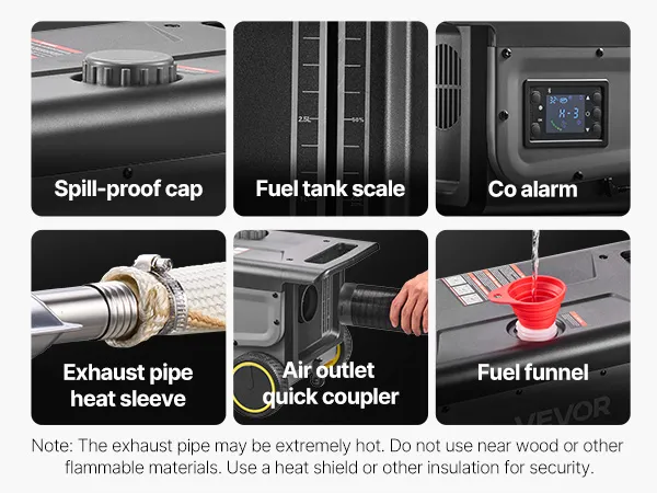 Funkcje bezpieczeństwa: Ten podgrzewacz powietrza na olej napędowy jest wyposażony w alarm CO, osłonę termiczną rury wydechowej oraz uszczelniony korek wlewu paliwa, co zapewnia bezpieczne, długotrwałe użytkowanie. Wewnętrzna płytka drukowana jest wyposażona w zabezpieczenie przed przegrzaniem, odwrotną polaryzacją i przepięciem.