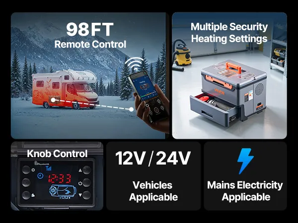 Szeroka kompatybilność: Nasze ogrzewanie postojowe jest kompatybilne z kamperami, ciężarówkami, SUV-ami, vanami, namiotami i garażami. Zasilane jest prądem stałym 12 V/24 V lub przemiennym i może pracować na wysokościach poniżej 3000 m n.p.m. Idealne do jazdy zimą i codziennego użytku.