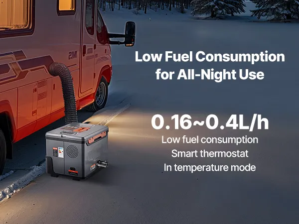 Oszczędność paliwa: Ten przenośny piecyk na olej napędowy jest wyposażony w cichą, energooszczędną pompę paliwa i zużywa 0,04–0,1 galona/h (0,16–0,4 l/h) paliwa, co przekłada się na ponad 90% wydajności. Zbiornik paliwa o pojemności 1,3 galona (5 l) umożliwia ogrzewanie w nocy bez tankowania, zmniejszając zużycie paliwa i straty energii.