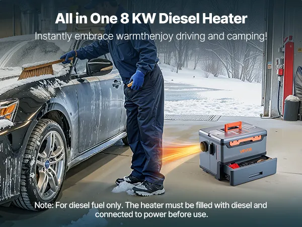 Ta przenośna nagrzewnica diesla o mocy 8 kW podłącza się do gniazdka elektrycznego w pojeździe i jest wyposażona w adapter do stacji ładowania lub domowego źródła prądu zmiennego. Zapewnia szybkie i wydajne ogrzewanie namiotów, sprzętu do wędkowania pod lodem, kamperów, ciężarówek, SUV-ów, vanów i innych pojazdów. Jest przeznaczona do pracy w niskich temperaturach i szybko ogrzewa duże przestrzenie.