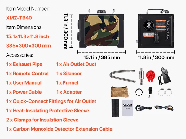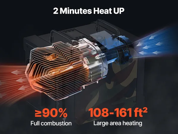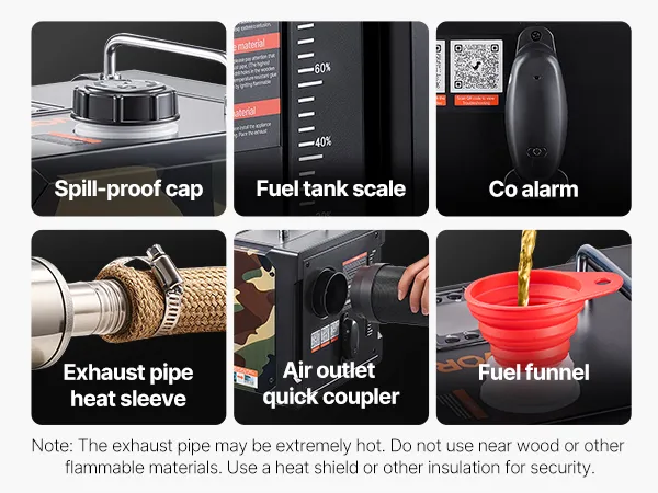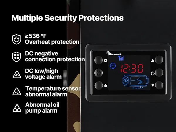 Funkcje bezpieczeństwa: Ten podgrzewacz powietrza na olej napędowy jest wyposażony w alarm CO, osłonę termiczną rury wydechowej oraz uszczelniony korek wlewu paliwa, co zapewnia bezpieczne, długotrwałe użytkowanie. Wewnętrzna płytka drukowana posiada zabezpieczenie przed przegrzaniem (powyżej 280°C/536°F), zabezpieczenie przed odwrotną polaryzacją oraz zabezpieczenie przeciwprzepięciowe.
