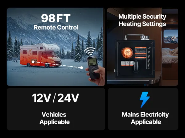 Szeroka kompatybilność: Nasze ogrzewanie postojowe na olej napędowy jest kompatybilne z kamperami, ciężarówkami i SUV-ami. Zasilane jest prądem stałym 12 V/24 V lub prądem przemiennym i może działać na wysokościach poniżej 3000 m (9842 stóp). Idealne do jazdy zimą i codziennego użytku.