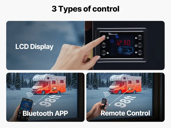 Sterowanie Bluetooth: Ten piecyk na olej napędowy obsługuje sterowanie Bluetooth z odległości do 30 m. Użyj smartfona do ustawiania timerów, podgrzewania i regulacji temperatury (8–36°C/46,4–96,8°F). Dla dodatkowej wygody można go również obsługiwać za pomocą pilota i wyświetlacza LCD.