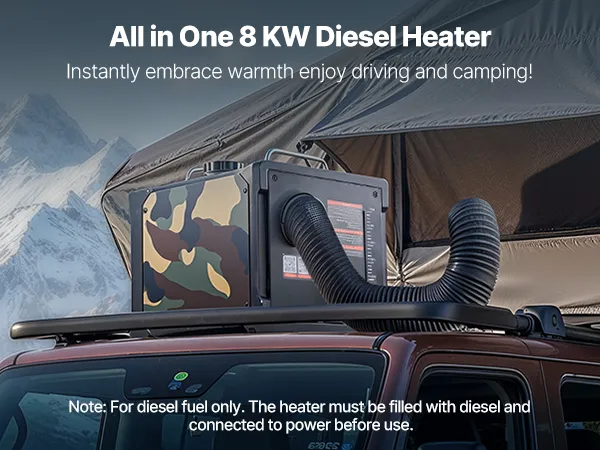 Ta przenośna nagrzewnica diesla o mocy 8 kW podłącza się do gniazdka elektrycznego w pojeździe i posiada adapter do stacji ładowania lub domowego źródła prądu zmiennego. Zapewnia szybkie i wydajne ogrzewanie namiotów, wędkarstwa podlodowego, kamperów, ciężarówek, SUV-ów i innych pojazdów. Jest przeznaczona do pracy w niskich temperaturach i szybko ogrzewa duże przestrzenie.