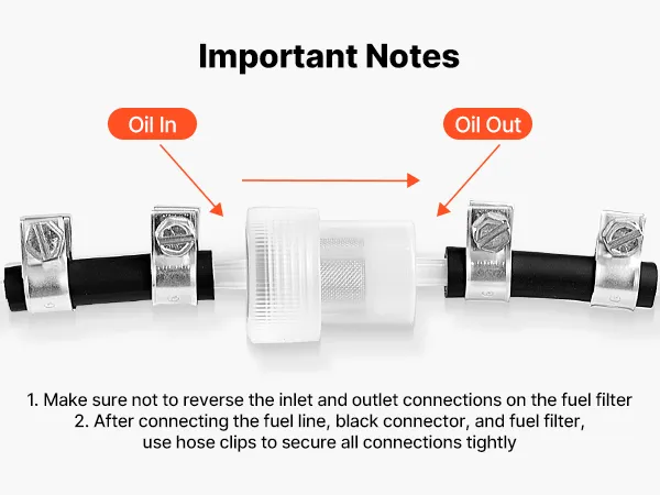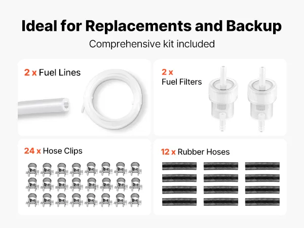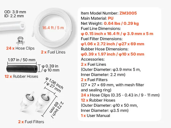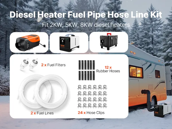 Kompletny zestaw: Otrzymasz kompletny zestaw naprawczy przewodu paliwowego do ogrzewania postojowego, zawierający dwa przewody paliwowe, dwa filtry, 24 zaciski i sześć węży. Zestaw ten spełnia Twoje potrzeby w zakresie instalacji i konserwacji większości ogrzewaczy powietrza z silnikiem Diesla o mocy 2 kW/5 kW/8 kW.