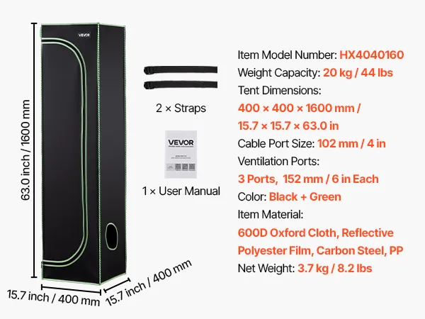 Przemyślana konstrukcja: wewnętrzny namiot hodowlany jest wyposażony w 1 port kablowy, 3 porty kanałowe i 1 okno z siatki, co optymalizuje przepływ powietrza, ułatwia zarządzanie kablami i wężami, zapewnia dobrą wentylację i chroni przed szkodnikami.
