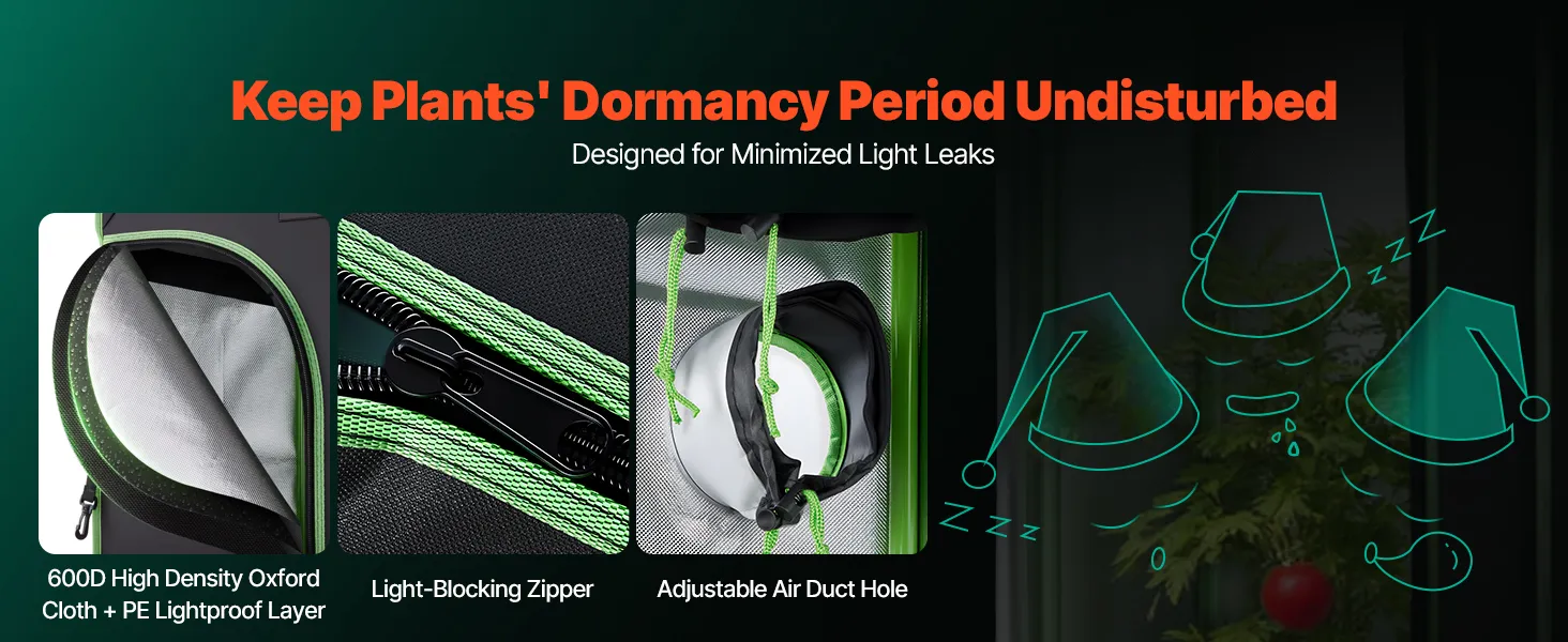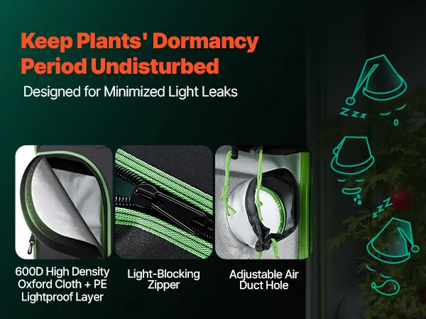 Namiot do uprawy roślin doniczkowych wyposażony jest w nieprzepuszczające światła zamki błyskawiczne i uszczelnione otwory wentylacyjne, które skutecznie zapobiegają przedostawaniu się światła i zapewniają roślinom prawidłowy cykl ciemności, co sprzyja zdrowemu wzrostowi i uśpieniu. Przyczynia się to do zwiększenia ogólnej wydajności wzrostu.