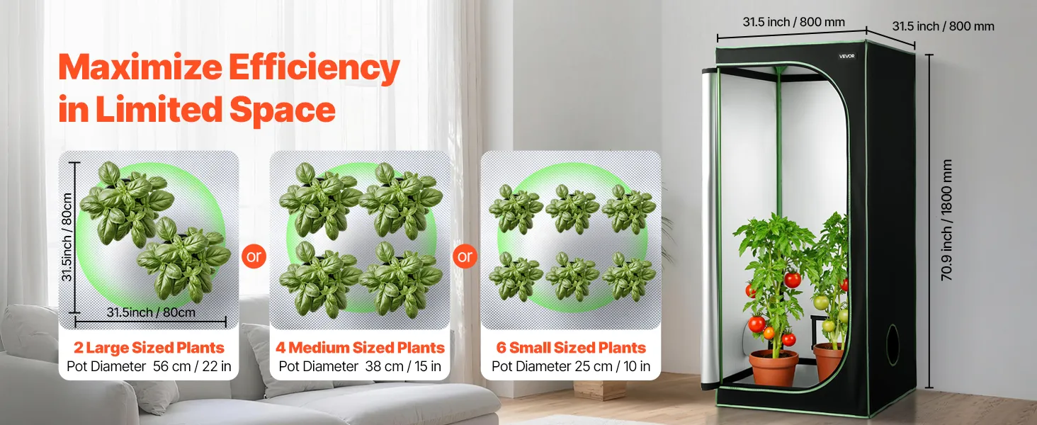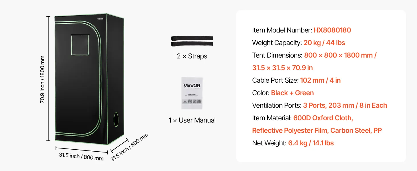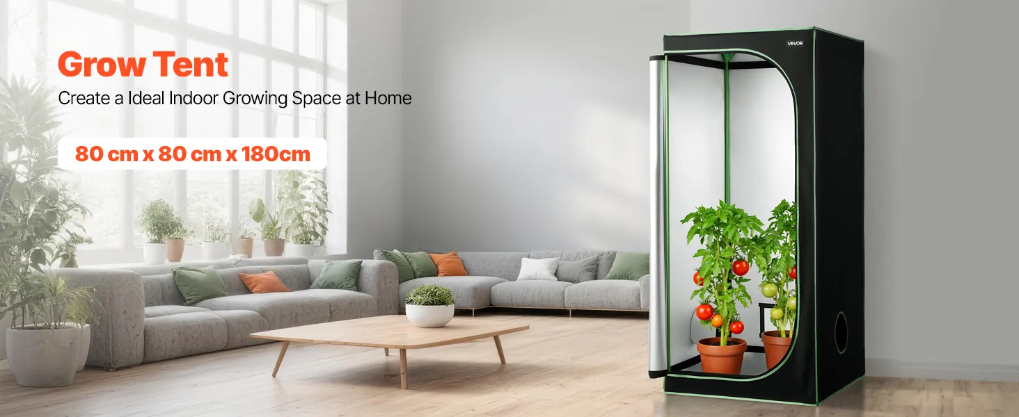 Namiot do uprawy VEVOR, 80x80x180 cm, Growbox 600D, wysoce odblaskowy Mylar, namiot do roślin doniczkowych z oknem obserwacyjnym, tacą na podłoże i zamkiem błyskawicznym, namioty do uprawy owoców, kwiatów i warzyw w szklarniach