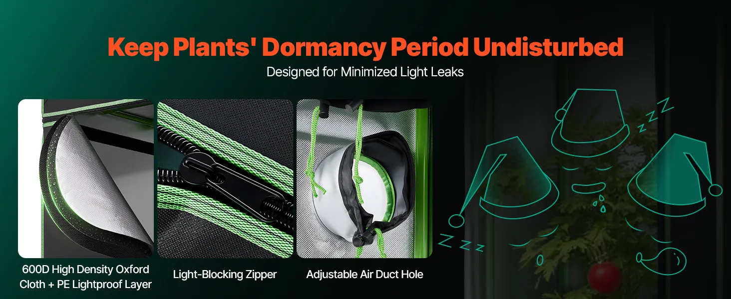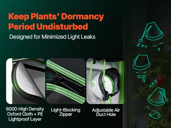 Namiot do uprawy roślin doniczkowych wyposażony jest w nieprzepuszczające światła zamki błyskawiczne i uszczelnione otwory wentylacyjne, które skutecznie zapobiegają przedostawaniu się światła i zapewniają roślinom prawidłowy cykl ciemności, co sprzyja zdrowemu wzrostowi i uśpieniu. Przyczynia się to do zwiększenia ogólnej wydajności wzrostu.