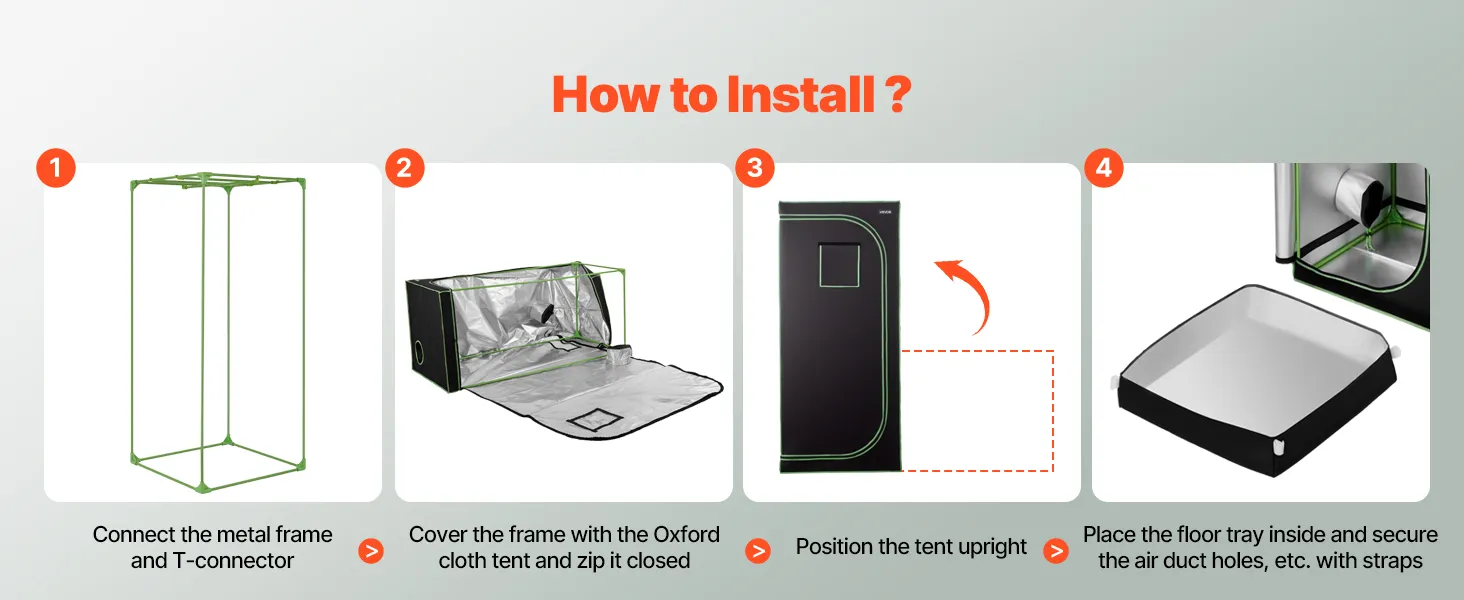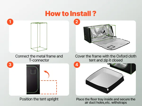 Wnętrze w 100% odblaskowe: Wnętrze wykonane jest z folii poliestrowej, która maksymalizuje odbicie światła i minimalizuje utratę ciepła, sprzyjając zdrowszemu wzrostowi roślin. Zewnętrzna warstwa wykonana jest z wytrzymałej tkaniny Oxford 600D, odpornej na rozdarcia i nieprzezroczystej. Podwójne, czarne zamki skutecznie uszczelniają wszelkie szczeliny.