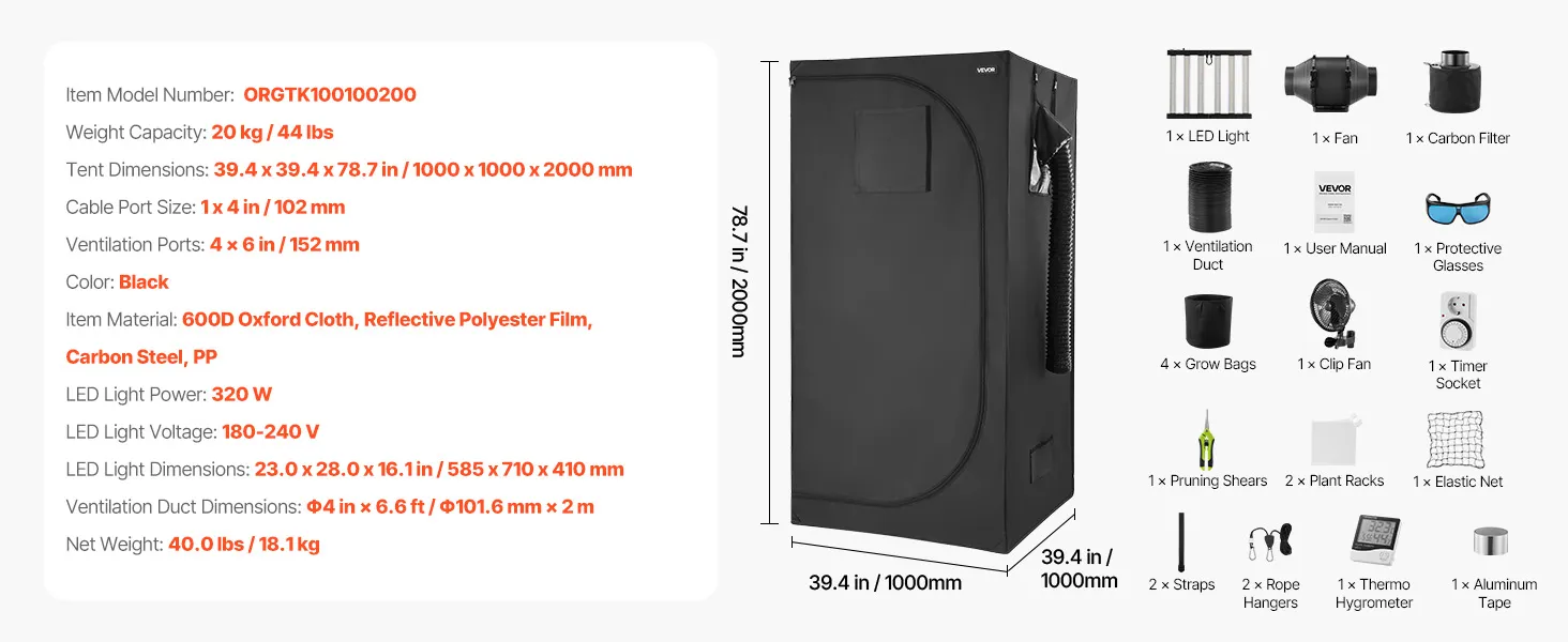 Kompletny zestaw namiotu do uprawy: Kompleksowy zestaw, idealny dla początkujących, którzy chcą szybko zacząć. Zawiera lampę LED do uprawy, wentylator z klipsem, wentylator kanałowy, wąż wentylacyjny, filtr węglowy, timer, miernik temperatury i wilgotności, a także worki na rośliny, nożyczki, szklane słoiki i inne akcesoria. Namiot do uprawy wewnętrznej jest wyposażony w wydajny system zarządzania kablami i kanałami, co ułatwia jego montaż.