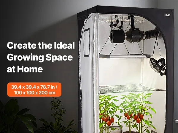 Ten kompletny zestaw namiotu do uprawy w pomieszczeniach oferuje stabilne oświetlenie i optymalną kontrolę klimatu, dzięki czemu idealnie nadaje się do uprawy warzyw, ziół i innych roślin. Nawet w chłodniejszych porach roku nasz namiot zapewnia zdrowie i bujny wzrost roślin przez cały rok.