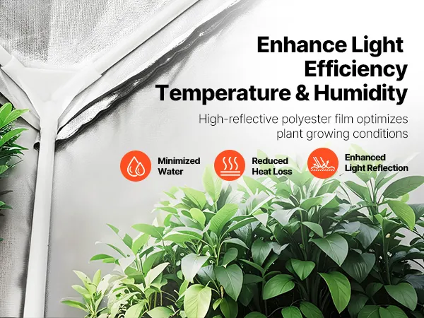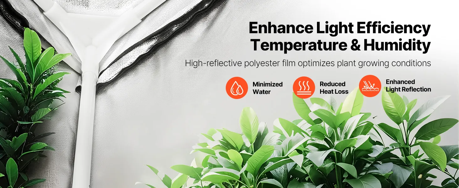 Wnętrze w 100% odblaskowe: Wnętrze namiotu jest wyłożone wysokiej jakości folią poliestrową, która poprawia odbicie światła i minimalizuje utratę ciepła, sprzyjając zdrowemu wzrostowi roślin. Zewnętrzna warstwa wykonana jest z wytrzymałej tkaniny Oxford 600D, odpornej na rozdarcia i światło. Zamki błyskawiczne z podwójną czarną podszewką skutecznie uszczelniają szczeliny.