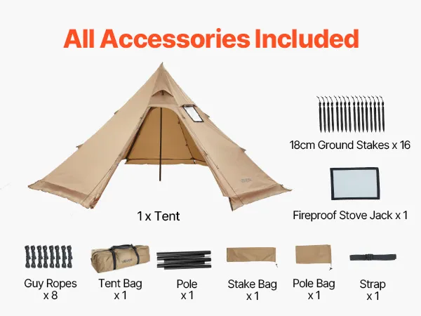 Całoroczny namiot tipi: Ten namiot tipi idealnie nadaje się na kemping rodzinny i grupowy. Wyposażony w trudnopalne przyłącze do kuchenki, co umożliwia całoroczne użytkowanie, ten namiot tipi sprawia, że biwakowanie w chłodne dni jest łatwe i wygodne.
