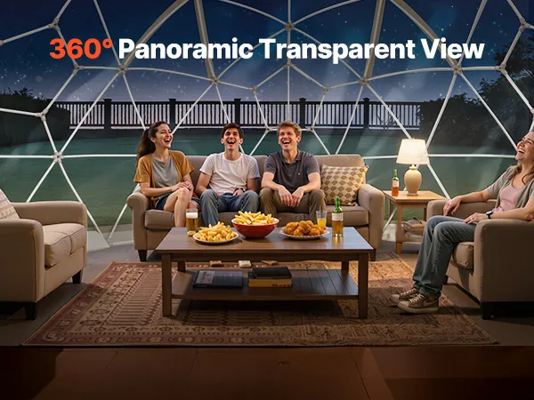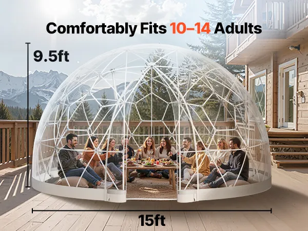 Przestronna i komfortowa konstrukcja: Kopuła o średnicy 4,57 m i wysokości 2,9 m wygodnie pomieści 10-14 dorosłych osób. Idealna do dekoracji światłem lub ustawienia mebli ogrodowych. Drzwi o wysokości 2,1 m i boczne trójkątne okna zapewniają dodatkową wentylację i komfort.