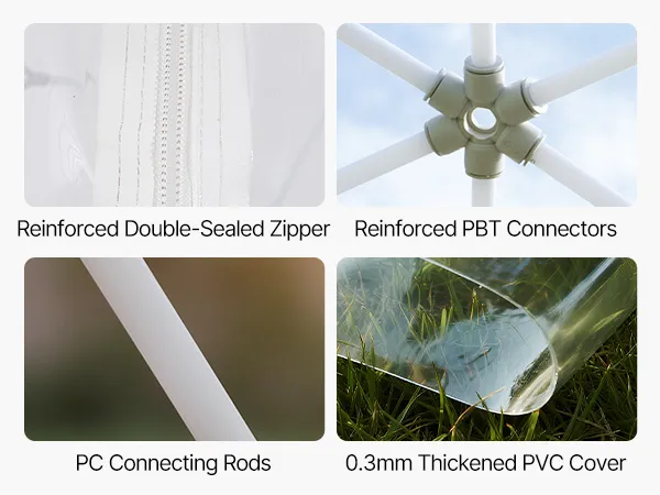 Wytrzymały i odporny na warunki atmosferyczne: Wyposażony w nierdzewne słupki z poliwęglanu (PC), ulepszone łączniki PBT oraz PVC o grubości 0,3 mm, namiot kopułowy jest odpowiedni do temperatur od -15°C do 40°C, wytrzymuje wiatr o prędkości do 50 km/h i 40 kg śniegu. Śledzie, zaciski i worki z piaskiem zapewniają dodatkową stabilność w trudnych warunkach.