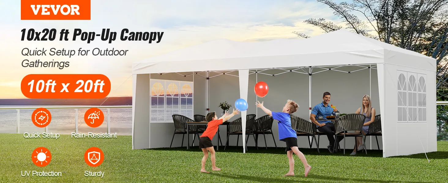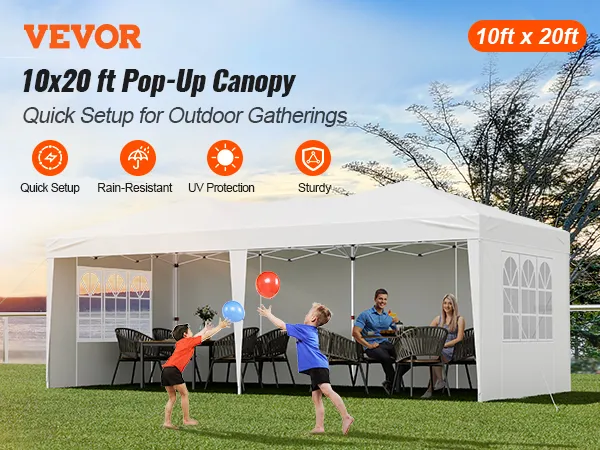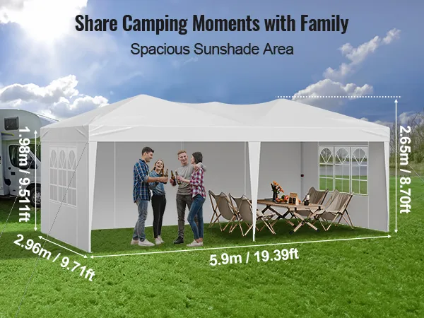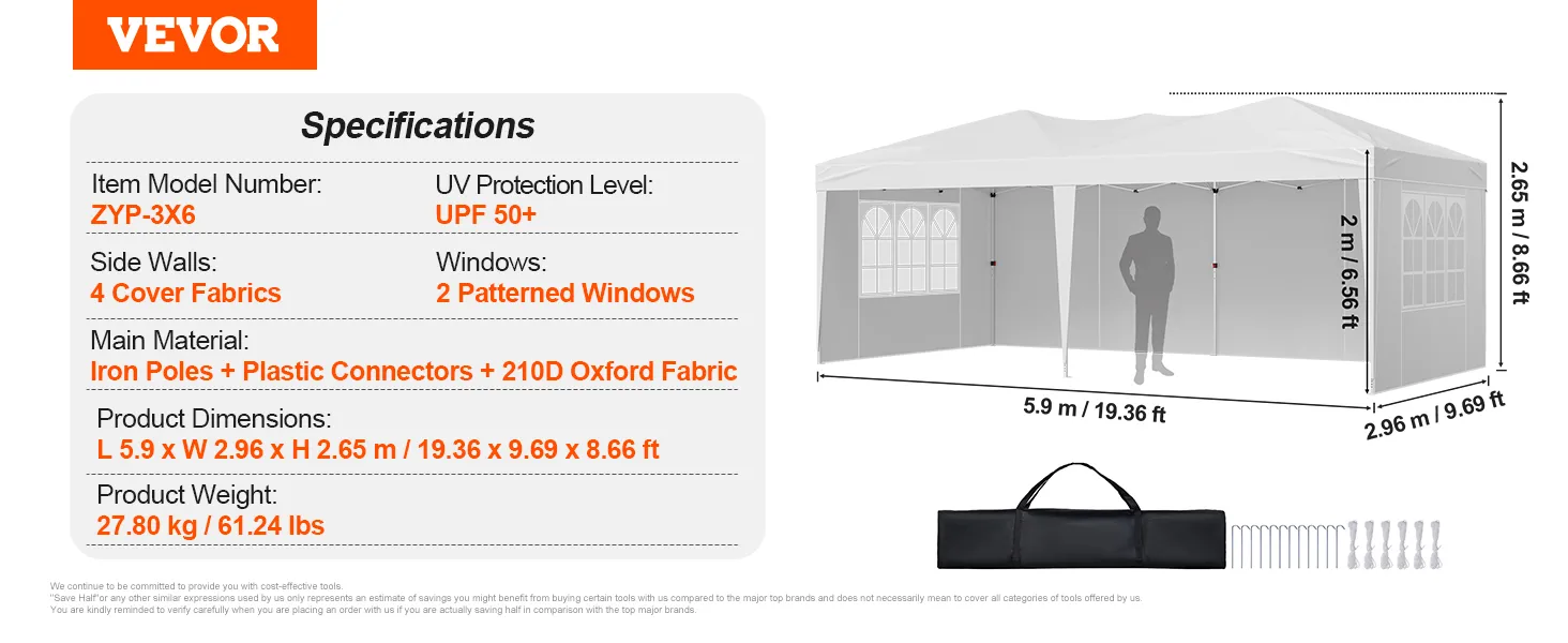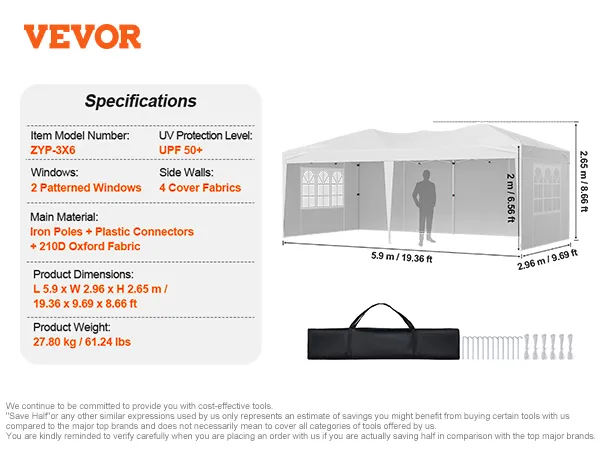 Altana VEVOR, 5,9 x 2,96 x 2,65 m, markiza, namiot ogrodowy ze ścianami bocznymi i wentylowanymi oknami, 3 ustawienia wysokości, ochrona przed słońcem na imprezy plenerowe, kolor biały