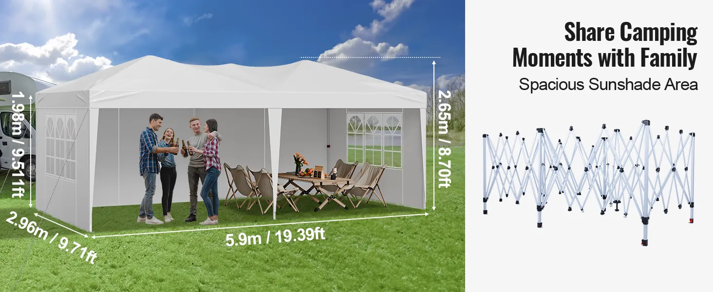 Duża przestrzeń: Dzięki dużej powierzchni ten rozkładany namiot może pomieścić kilka osób, co czyni go idealnym rozwiązaniem na spotkania rodzinne, grille i imprezy branżowe, ponieważ z łatwością zmieści się w nim stoł i krzesła.