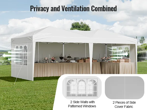 Ta rozkładana markiza ma dwa boczne panele z wzorzystymi okienkami, które zapewniają prywatność, umożliwiają dobrą wentylację i poprawiają ogólną estetykę.