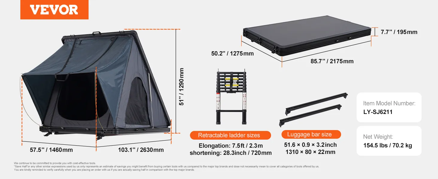 Drabina teleskopowa 2,3 m: W zestawie znajduje się 7-sekcyjna aluminiowa drabina teleskopowa o maksymalnym udźwigu 150 kg (330 funtów), ułatwiająca dostęp do namiotu. Drabinę można regulować i wydłużyć do 2,3 m (7,5 stopy) lub skrócić do 72 cm (28,3 cala), aby dopasować ją do pojazdów o różnej wysokości.