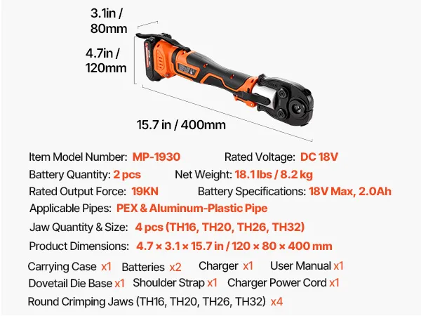 4 uniwersalne rozmiary szczęk: Ta elektryczna zaciskarka 18 V, przeznaczona do rur PEX i aluminiowo-plastikowych, zawiera 4 wymienne szczęki zaciskające (TH16 mm, TH20 mm, TH26 mm, TH32 mm) i dzięki temu pokrywa szeroki zakres rozmiarów rur dla różnych wymagań zaciskania.