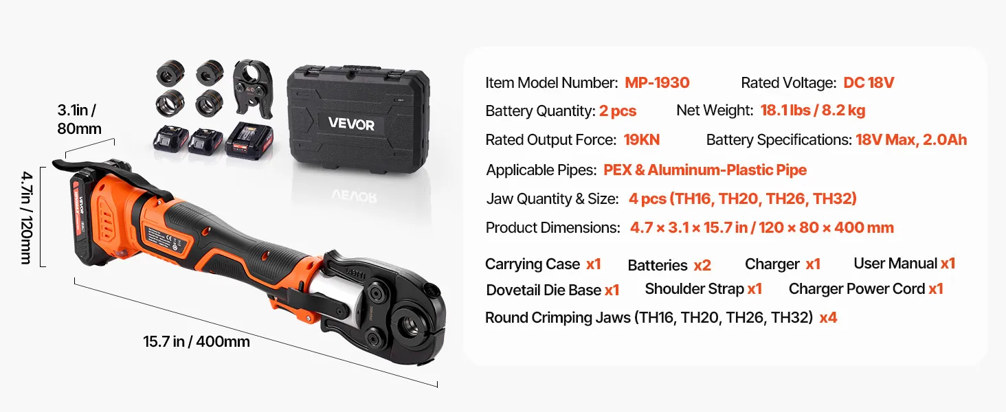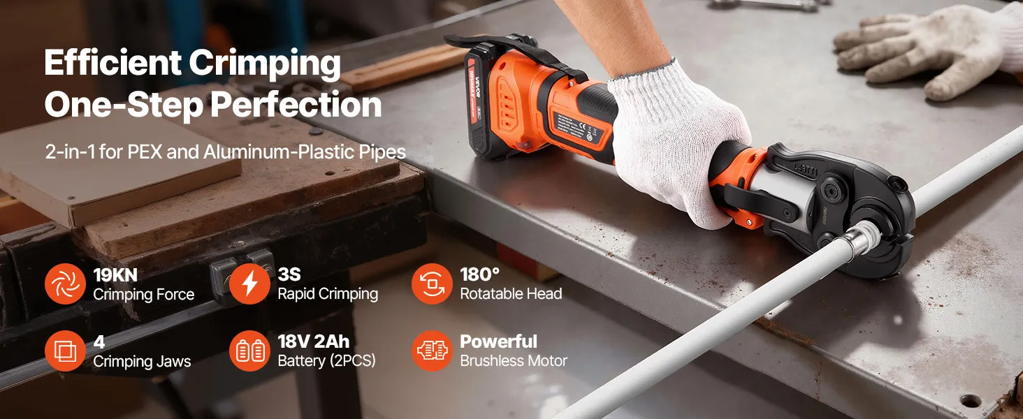 Elektryczna zaciskarka do rur VEVOR 18 V jest wyposażona w cztery szczęki zaciskające (TH16 mm, TH20 mm, TH26 mm, TH32 mm) do rur PEX oraz rur aluminiowo-plastikowych. Napędzana wydajnym silnikiem bezszczotkowym, umożliwia szybkie, szczelne zaciskanie i bezpieczne połączenia. Bezprzewodowa i przenośna, zapewnia elastyczność użytkowania w podróży.