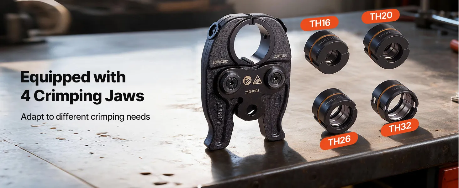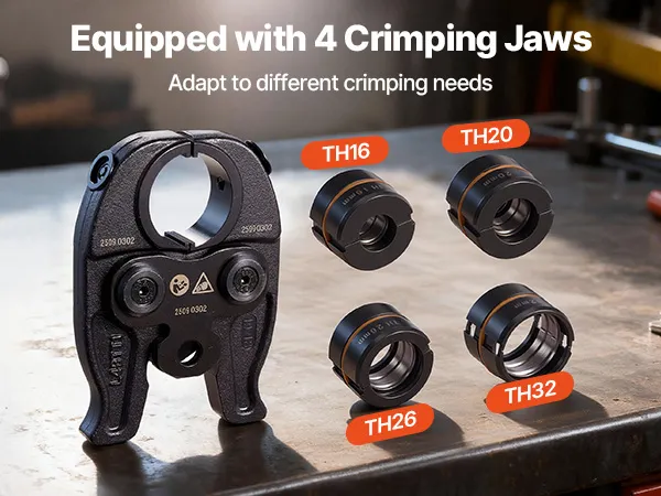 Zawiera 4 wymienne szczęki zaciskowe (TH16 mm, TH20 mm, TH26 mm, TH32 mm) zapewniające elastyczność w stosowaniu z rurami o różnych średnicach. Osiągaj szybsze, precyzyjniejsze i lepszej jakości zaciski bez wysiłku.