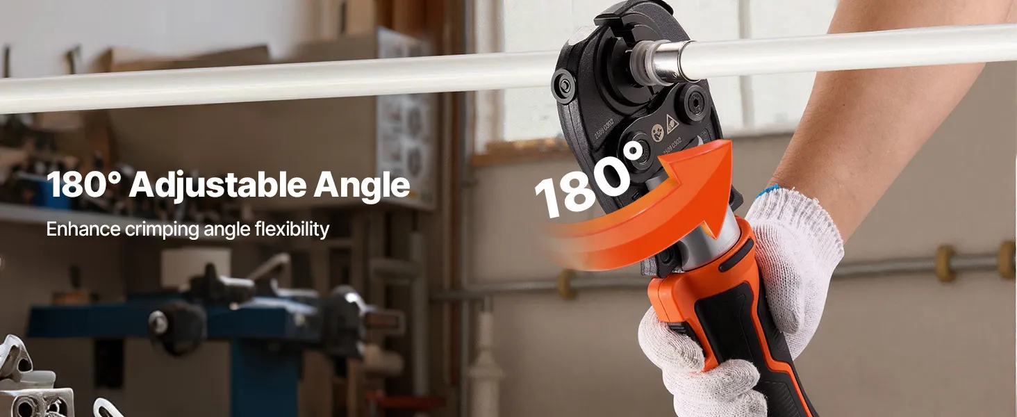 Głowicę zaciskającą można łatwo obrócić o 180°, aby dotrzeć nawet do ciasnych lub nachylonych miejsc. Pozwala to na elastyczne pozycjonowanie i precyzyjne zaciskanie, nawet w trudno dostępnych miejscach.
