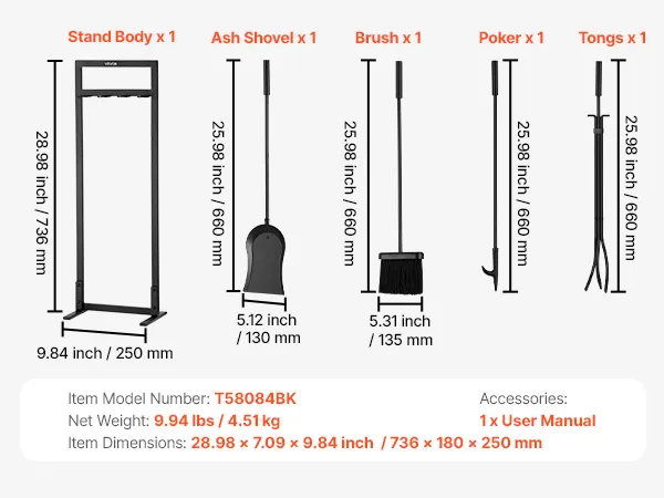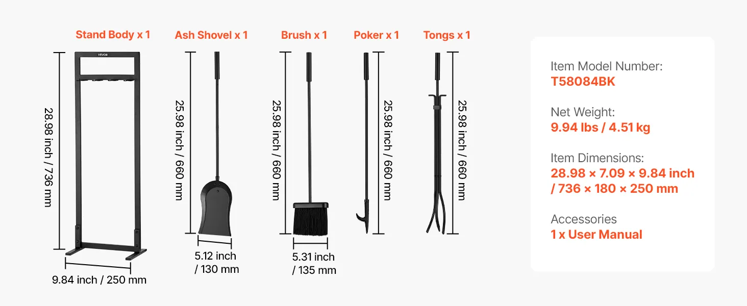Oszczędność miejsca: Ten kompaktowy dodatek kominkowy o wysokości 736 mm pozwala zachować porządek we wszystkich narzędziach, oszczędzając jednocześnie miejsce. Praktyczny i stylowy, nadaje się do kominków wewnętrznych, pieców opalanych drewnem, palenisk zewnętrznych i na kemping.