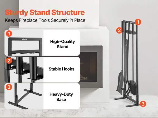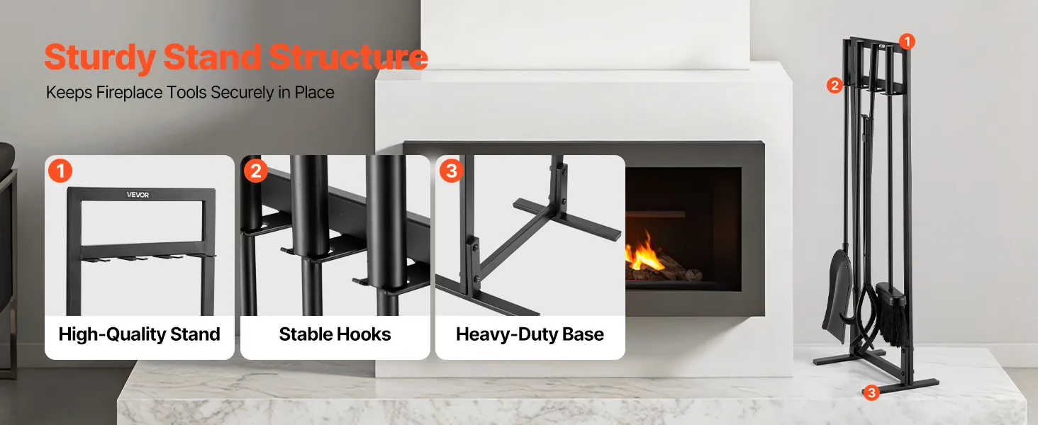 Dzięki solidnemu i wysokiej jakości stojakowi, solidnym haczykom i wytrzymałej podstawie, ten zestaw narzędzi kominkowych bezpiecznie utrzymuje każdy element na swoim miejscu. Stabilna konstrukcja zapewnia porządek i łatwy dostęp do narzędzi.