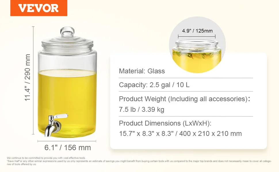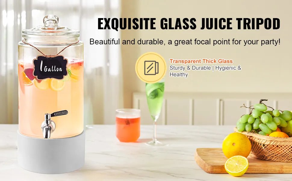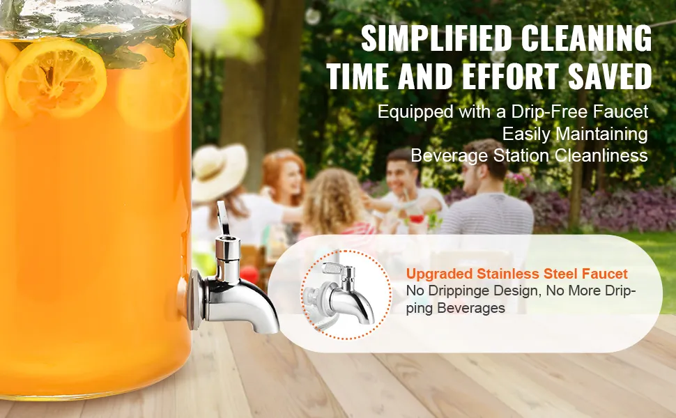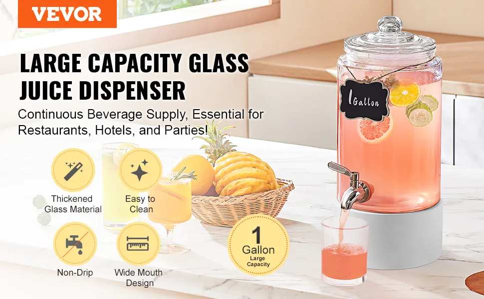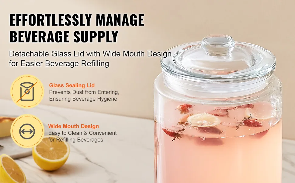 Ten wysokiej jakości szklany dozownik do soków jest wykonany z najwyższej jakości szkła. Materiał ten jest trwały, stabilny i odporny na plamy i odkształcenia. Możesz dodawać kostki lodu bez obaw o pęknięcie lub odkształcenie dozownika. Łatwo go czyścić, namaczając lub myjąc w zmywarce. Te cechy zapewniają, że pojemnik pozostaje czysty i gotowy do użycia. Materiał szklany dodaje odrobinę elegancji, będąc jednocześnie praktycznym — idealnym zarówno do użytku domowego, jak i komercyjnego.