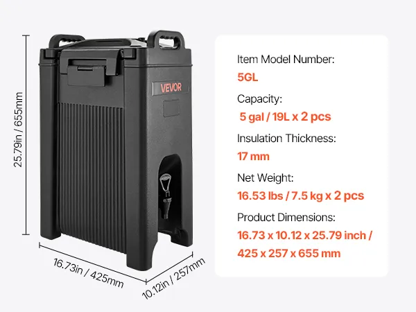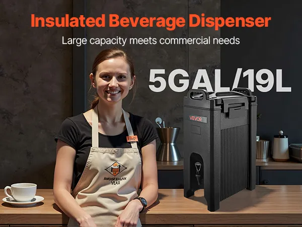Duża pojemność i wszechstronność: Ten izolowany dystrybutor napojów o pojemności 5 galonów (19 l) pomieści różnorodne gorące i zimne napoje, w tym kawę, mleko, herbatę i soki. Idealny do zastosowań komercyjnych i doskonały wybór do stacji z napojami.