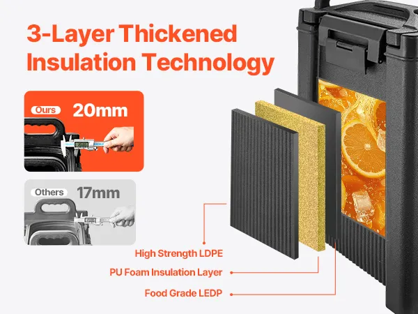 Trwała izolacja: Dzięki grubej warstwie pianki o wysokiej gęstości ten izolowany dozownik do napojów utrzymuje ciepło lub zimno napojów przez wiele godzin. Idealnie nadaje się do kawiarni, restauracji, bufetów, imprez plenerowych i innych zastosowań profesjonalnych.