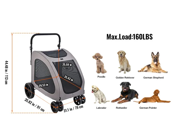 Wózek dla psa VEVOR 79x91x113 cm, wózek dla psa, 4 koła z hamulcami, wózek dla psa, ładowność do 73 kg, okna z oddychającej siatki, regulowana wysokość, tkanina Oxford 600D, dla psów i zwierząt domowych
