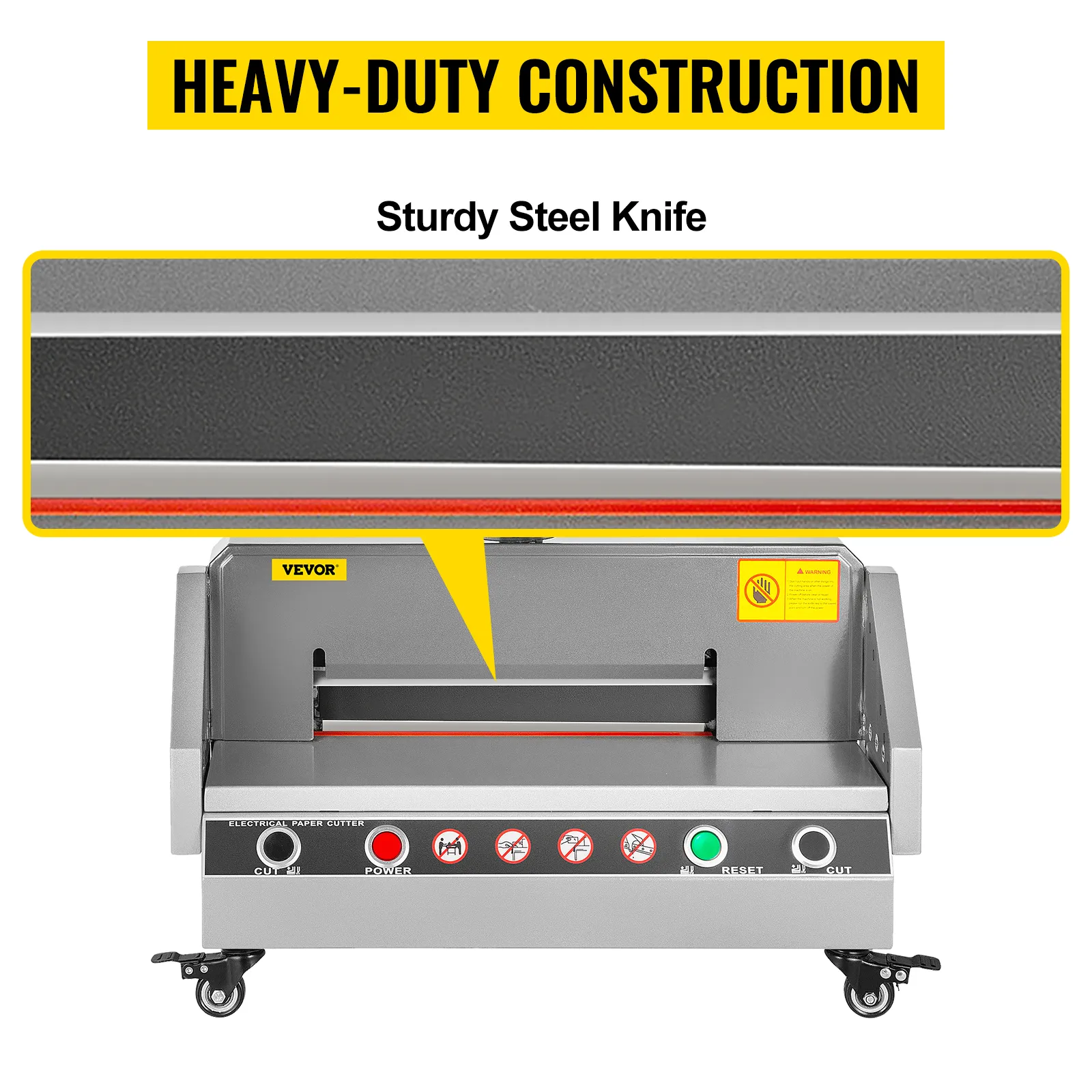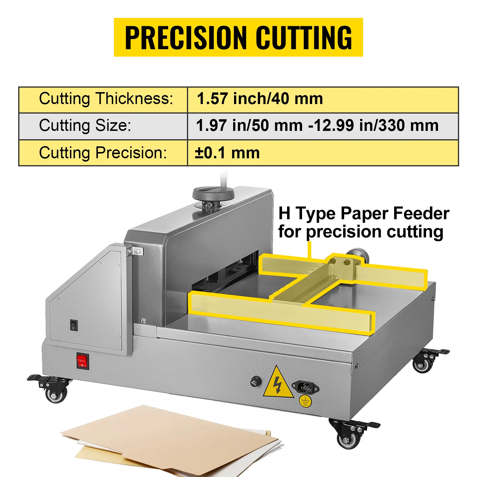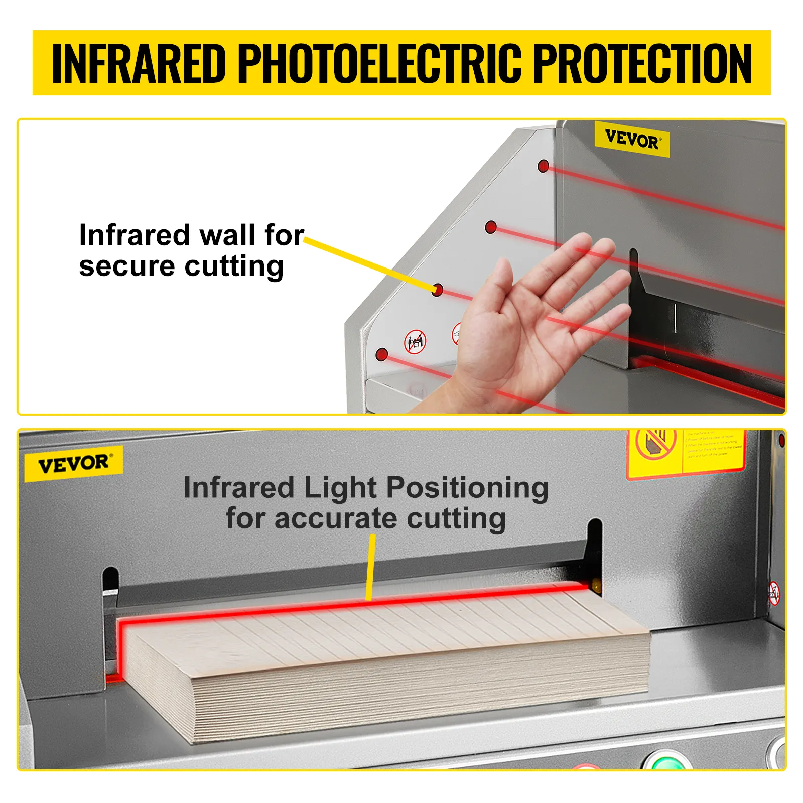 Obcinarka do papieru wykonana jest z wysokiej jakości blachy stalowej, co zapewnia długą żywotność i wysoką wydajność. Podajnik papieru typu H, precyzyjne cięcie: skutecznie rozwiązuje problem ze ślizganiem się, przesunięciem i niedokładnym cięciem tradycyjnego papieru sprężynowego. Zabezpieczenie fotoelektryczne na podczerwień zapewnia kompleksową ochronę środowiska pracy; jest to idealny wybór dla biur, szkół, kościołów, firm i drukarni.