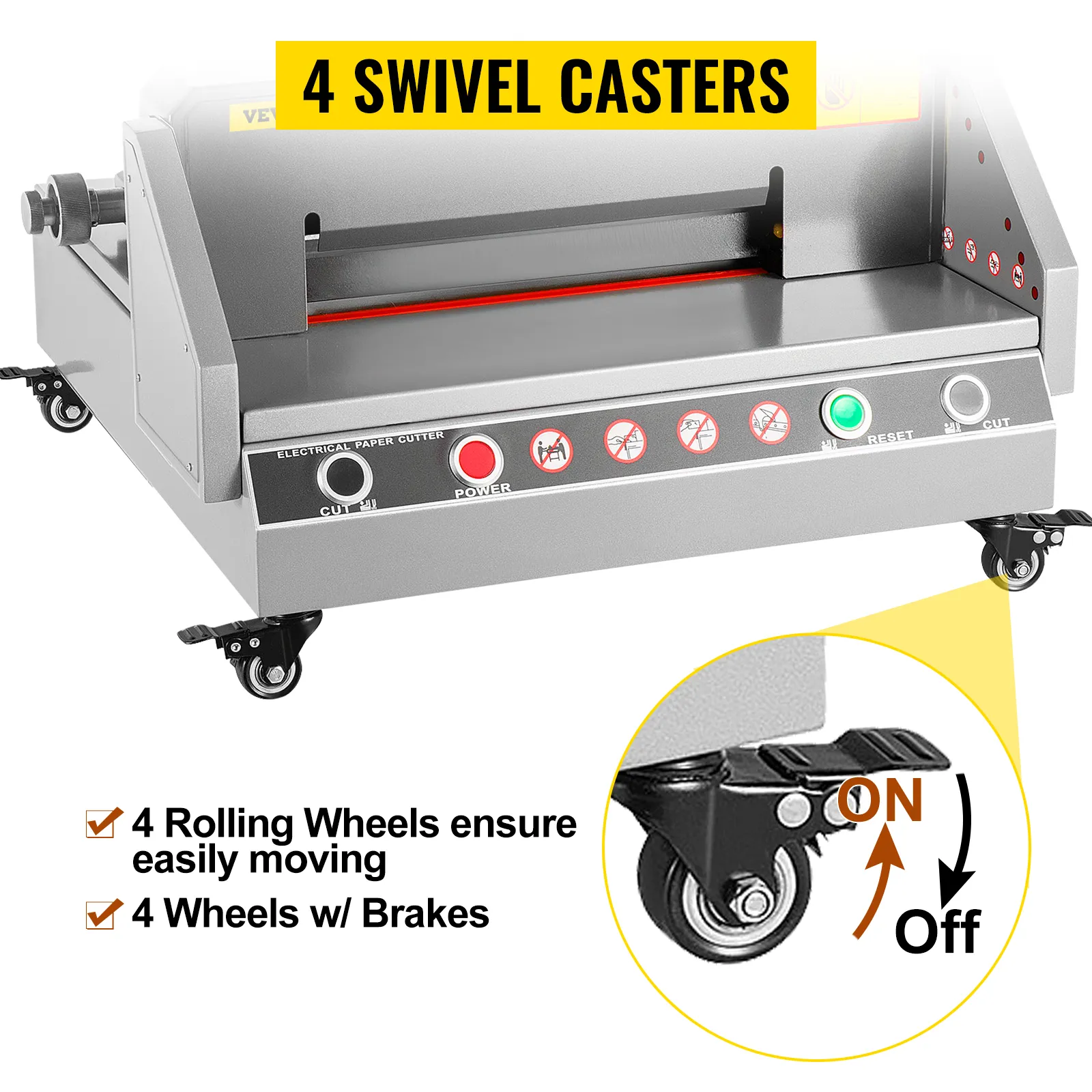 Obcinarka do papieru wyposażona jest w cztery kółka jezdne, które umożliwiają jej szybkie przemieszczanie i, w razie potrzeby, blokowanie w dowolnej pozycji.