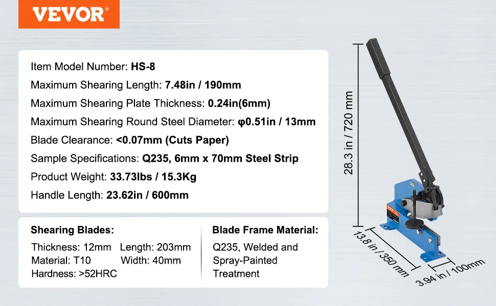 Nożyce są zbudowane tak, aby służyły długo. Oferują wysoką wydajność w przypadku ciężkich zadań. Waga maszyny wynosząca 33,73 funta zapewnia stabilność podczas użytkowania, co gwarantuje, że może ona wytrzymać częste użytkowanie bez zużycia i rozdarcia. Solidna konstrukcja oznacza również, że tnie grube materiały bez wyginania się. W rezultacie jest to niezawodne narzędzie zarówno dla profesjonalistów, jak i hobbystów obróbki metali.