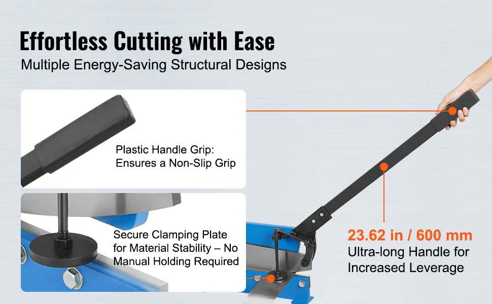 Nożyce mają długą rączkę o długości 23,62 cala, zapewniającą doskonałą dźwignię. Dzięki temu cięcie jest łatwe, nawet w przypadku grubszych materiałów. Konstrukcja stołu roboczego zapewnia stabilność podczas użytkowania. Ponadto długość rączki zmniejsza potrzebę użycia nadmiernej siły, dzięki czemu łatwiej jest używać nożyc przez dłuższy czas. Są zatem przyjazne dla użytkownika, zwłaszcza dla osób początkujących w obróbce metali. Ponadto jego konstrukcja minimalizuje zmęczenie dłoni, zapewniając komfort podczas całego projektu.