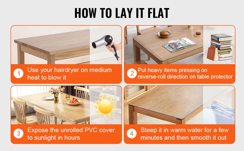 Łatwy w użyciu: Aby w pełni wykorzystać możliwości plastikowej maty stołowej, wykonaj następujące proste kroki: a. Otwórz opakowanie i wytrzyj kurz i brud wilgotną ściereczką. b. Użyj suszarki do włosów ustawionej na średnią temperaturę i trzymaj matę w odległości około 10 cm od podłoża, aby skutecznie ją spłaszczyć. c. Przygotuj wilgotną powierzchnię roboczą i rozłóż matę płasko. Użyj folii spożywczej, aby usunąć pęcherzyki powietrza i zapewnić wygodę i estetyczny wygląd.