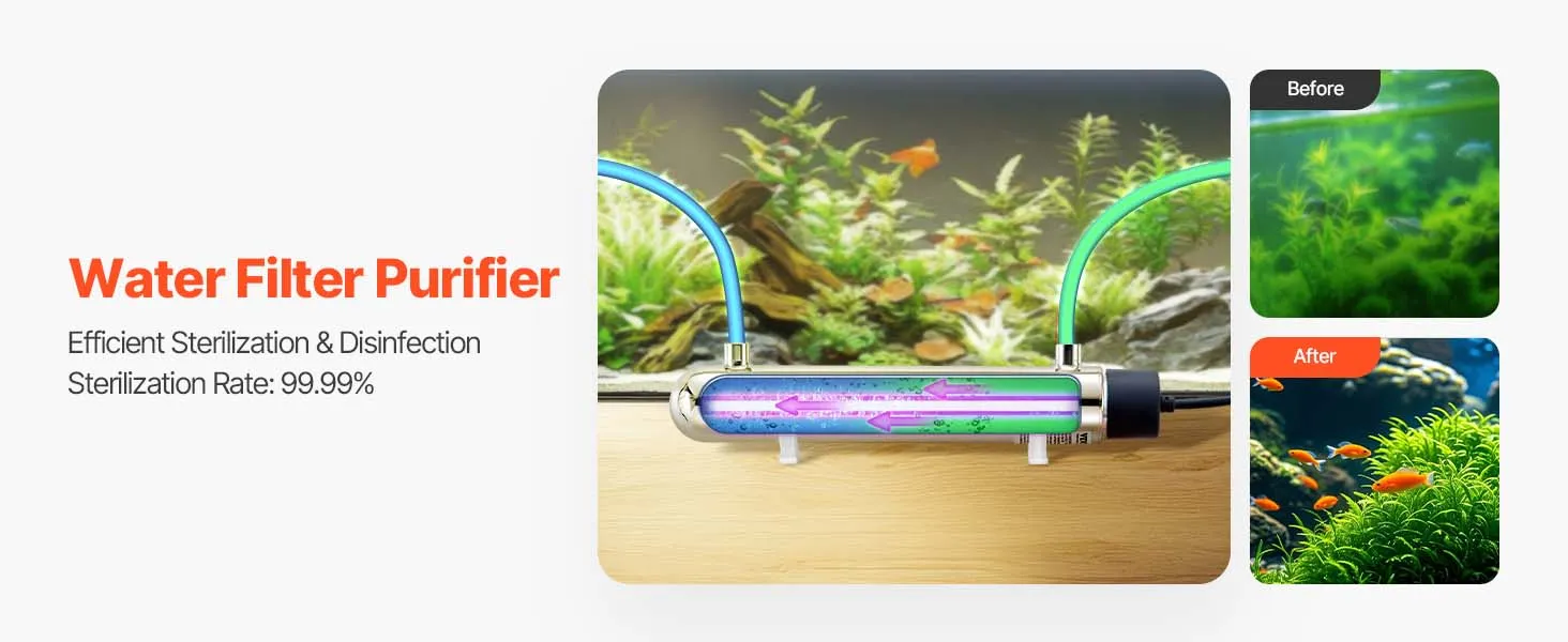 Filtr UV do wody zapewnia czystą, wolną od bakterii wodę o skuteczności sterylizacji 99,99%. Dzięki wytrzymałej komorze ze stali nierdzewnej i lampie UV o żywotności do 8000 godzin gwarantuje długotrwałą wydajność. Łatwy w instalacji i obsłudze, ciesz się natychmiast oczyszczoną wodą!
