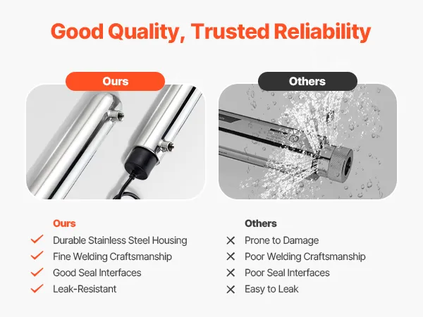 Bezpieczna i niezawodna konstrukcja: korpus rury jest czyszczony ultradźwiękowo w wysokich temperaturach, co zapewnia usunięcie wszelkich zanieczyszczeń lub ciał obcych, zapobiegając w ten sposób wtórnemu zanieczyszczeniu. Wyposażony w alarm awarii systemu UV umożliwiający łatwe rozwiązywanie problemów. Trwała osłona kwarcowa zapewnia bezpieczną ochronę lampy UV. Procesy uszczelniania i spawania są dobre i zapobiegają wyciekom wody