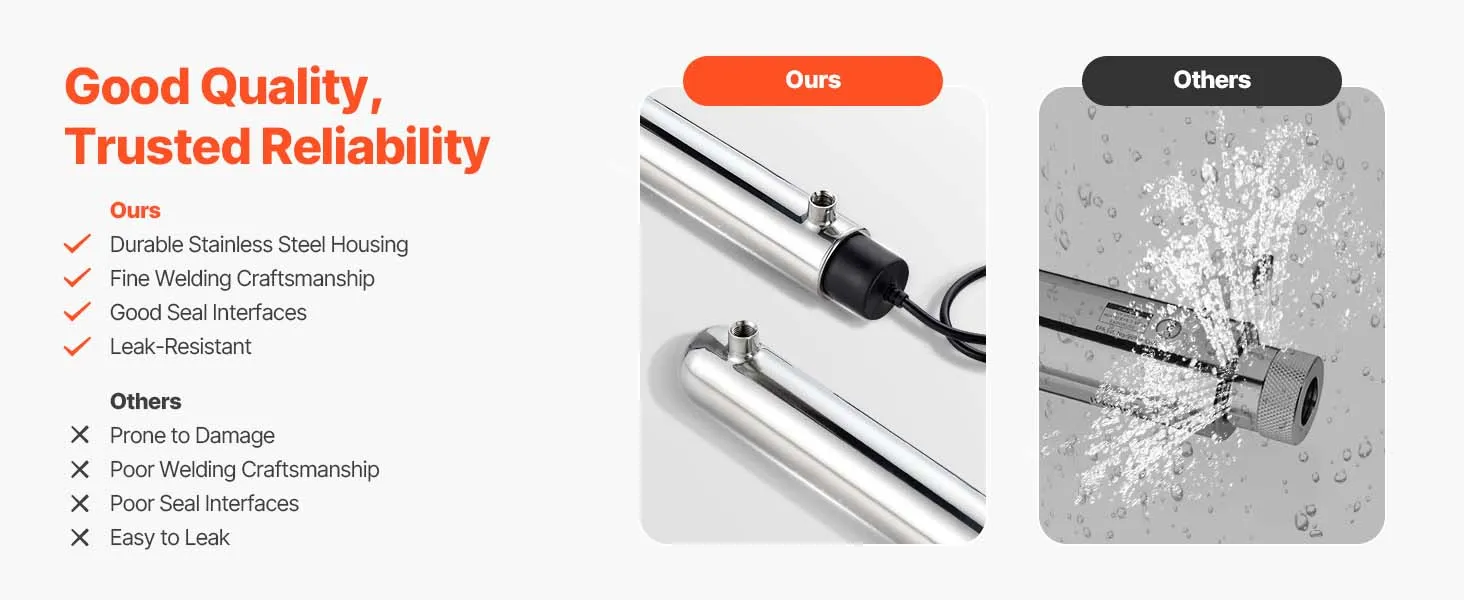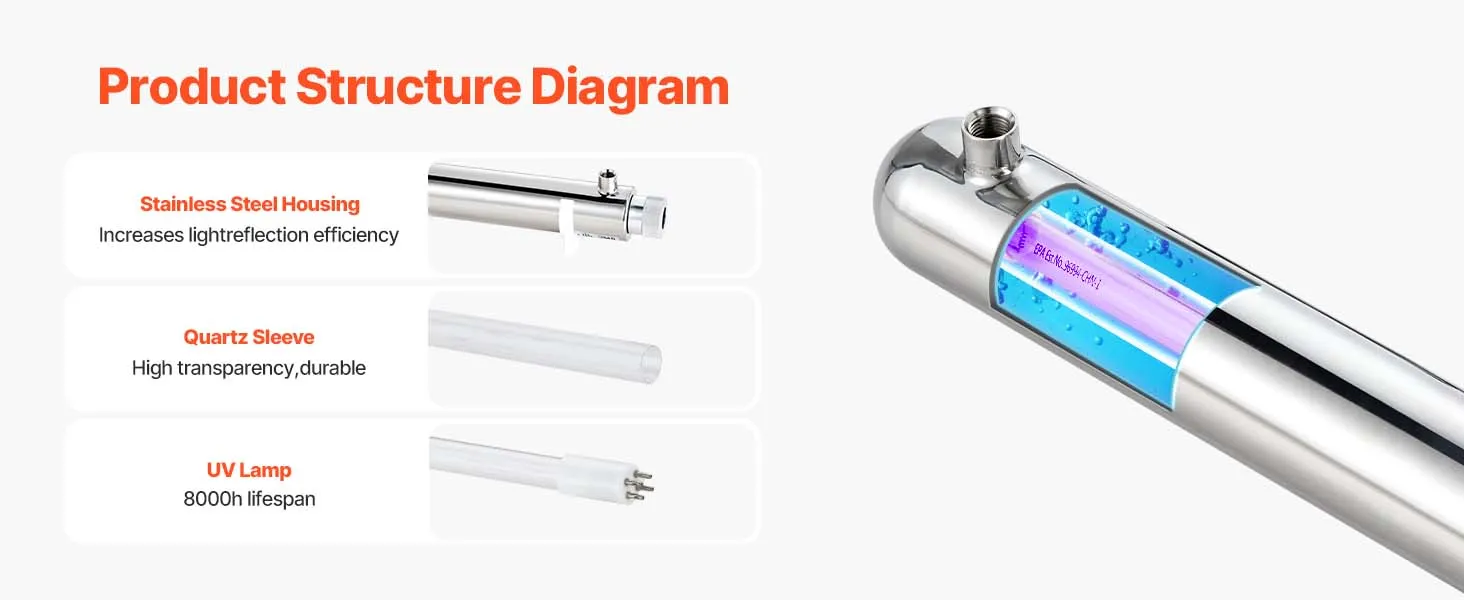Efektywne czyszczenie UV: Komora ze stali nierdzewnej poprawia skuteczność odbijania promieniowania UV i osiąga skuteczność sterylizacji na poziomie 99,99%. Dzięki lampie UV o żywotności 8000 godzin i niezwykle stabilnemu statecznikowi elektronicznemu zapewnia stałą, czystą wodę dla całego gospodarstwa domowego