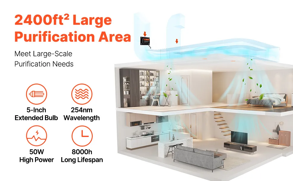 VEVOR HVAC Oczyszczacz powietrza do całego domu, lampa UVC 50 W 254 nm do kanałów klimatyzacyjnych, myjka powietrza z 2 zapasowymi żarówkami, lampy UV HVAC, oczyszczacz powietrza do klimatyzatorów