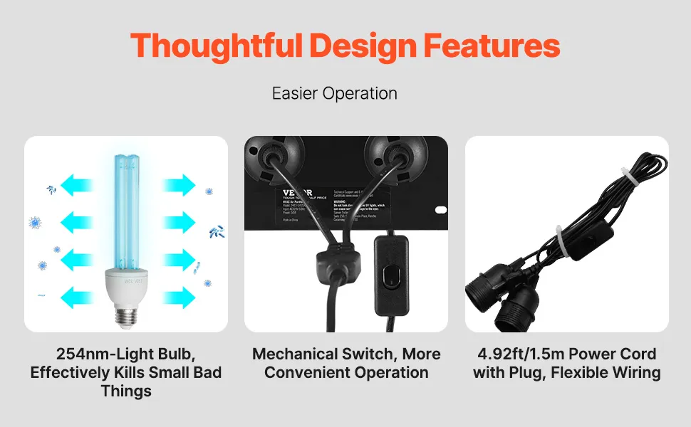 Łatwa obsługa i konserwacja: Sterowanie za pomocą przełącznika mechanicznego jest proste, a wskaźnik LED wyraźnie pokazuje stan pracy lampy UV-C. Przewód zasilający o długości 1,5 metra zapewnia większą elastyczność instalacji.