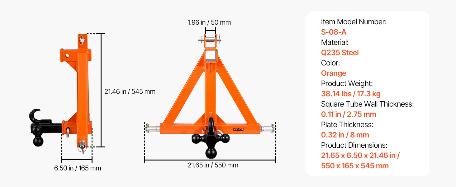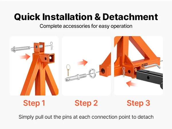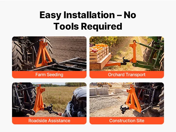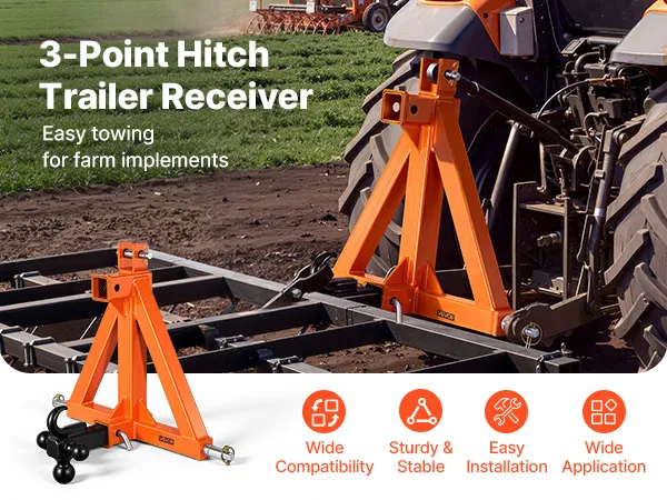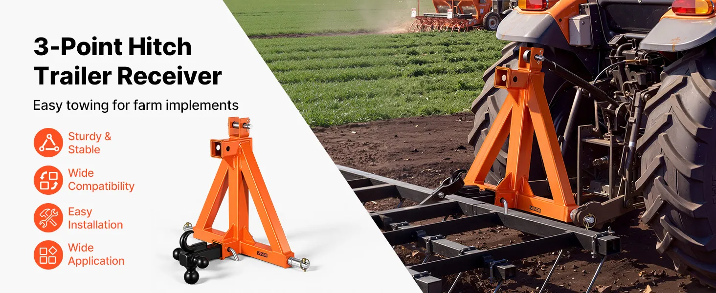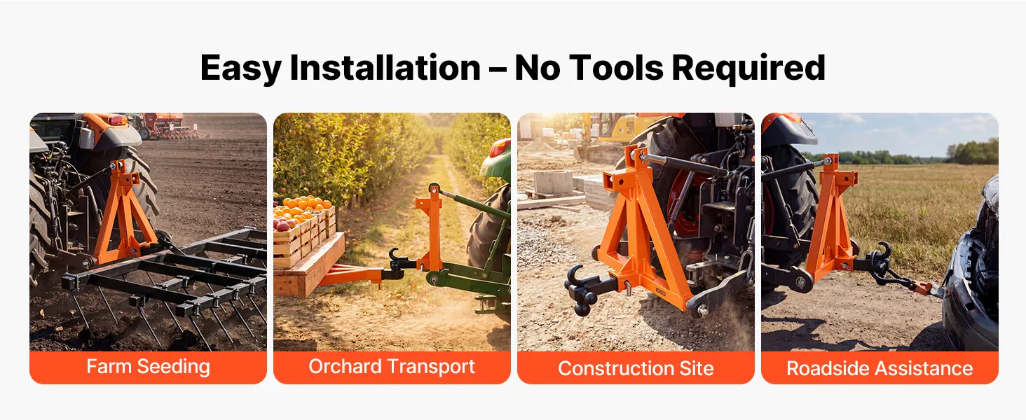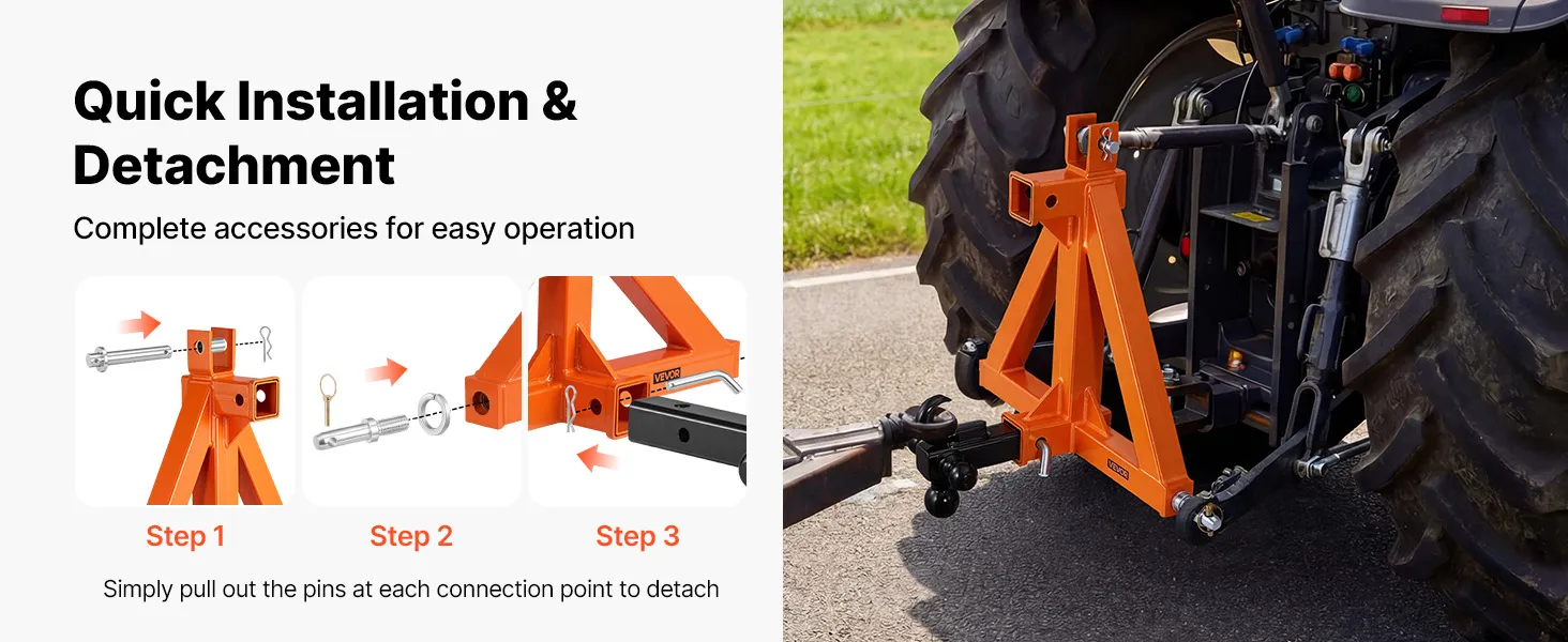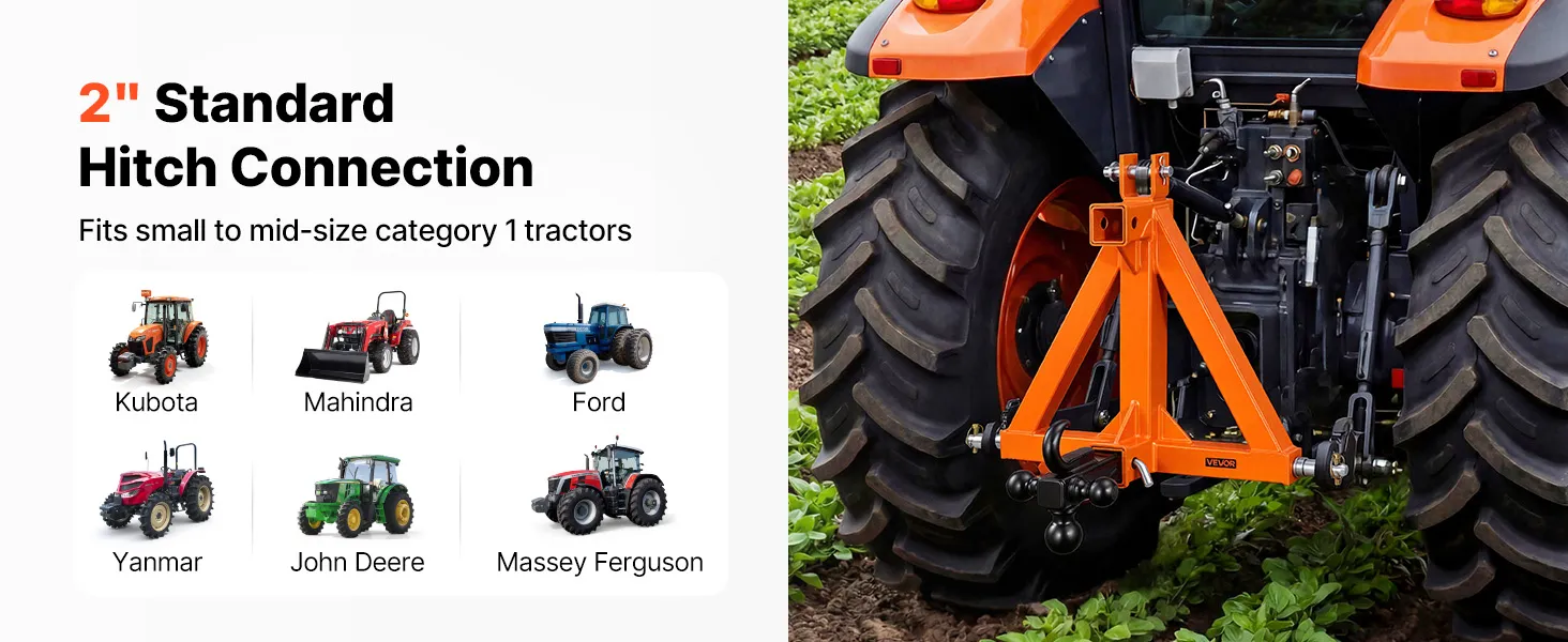 Doskonała kompatybilność: Ten 3-punktowy zaczep jest przeznaczony do ciągników kategorii 1 ze standardowym przyłączem 2-calowym i pasuje do różnych ciągników kompaktowych (Kubota/Mahindra/Ford/Yanmar/John Deere/Massey Ferguson). Zapewnia niezawodne i stabilne połączenie.