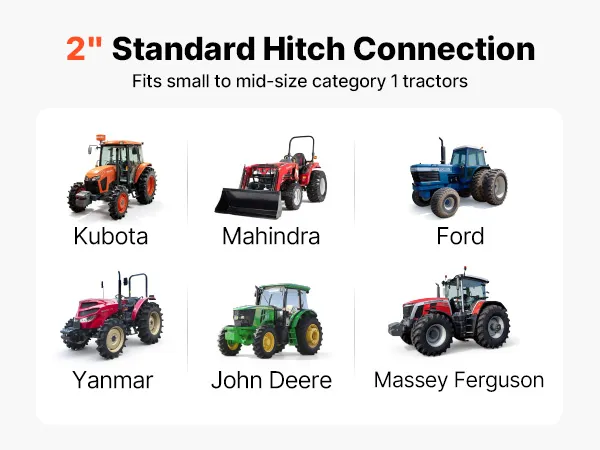 Dzięki standardowemu 2-calowemu połączeniu, ten trzypunktowy układ zawieszenia jest kompatybilny z szeroką gamą ciągników kategorii 1. Obsługuje modele popularnych marek, takich jak Kubota, Mahindra, Ford, Yanmar, John Deere i Massey Ferguson.
