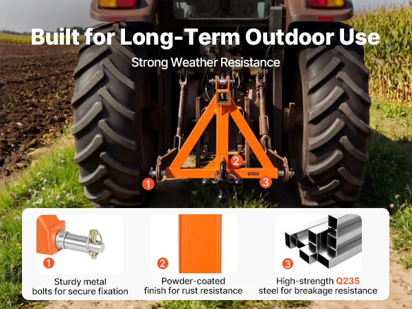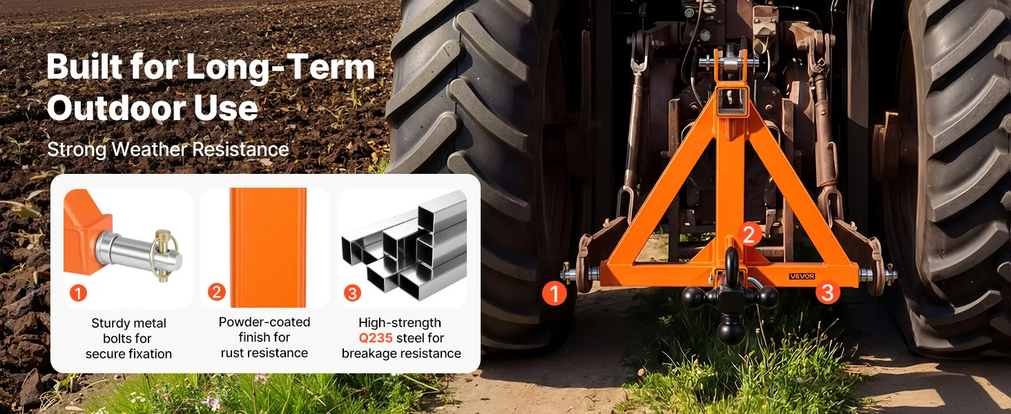 Odporność na rdzę: 3-punktowy hak holowniczy pokryty jest odporną na rdzę powłoką proszkową, która zapewnia odporność na zużycie i rdzę. Nadaje się do długotrwałego użytkowania na zewnątrz w różnych warunkach pogodowych.