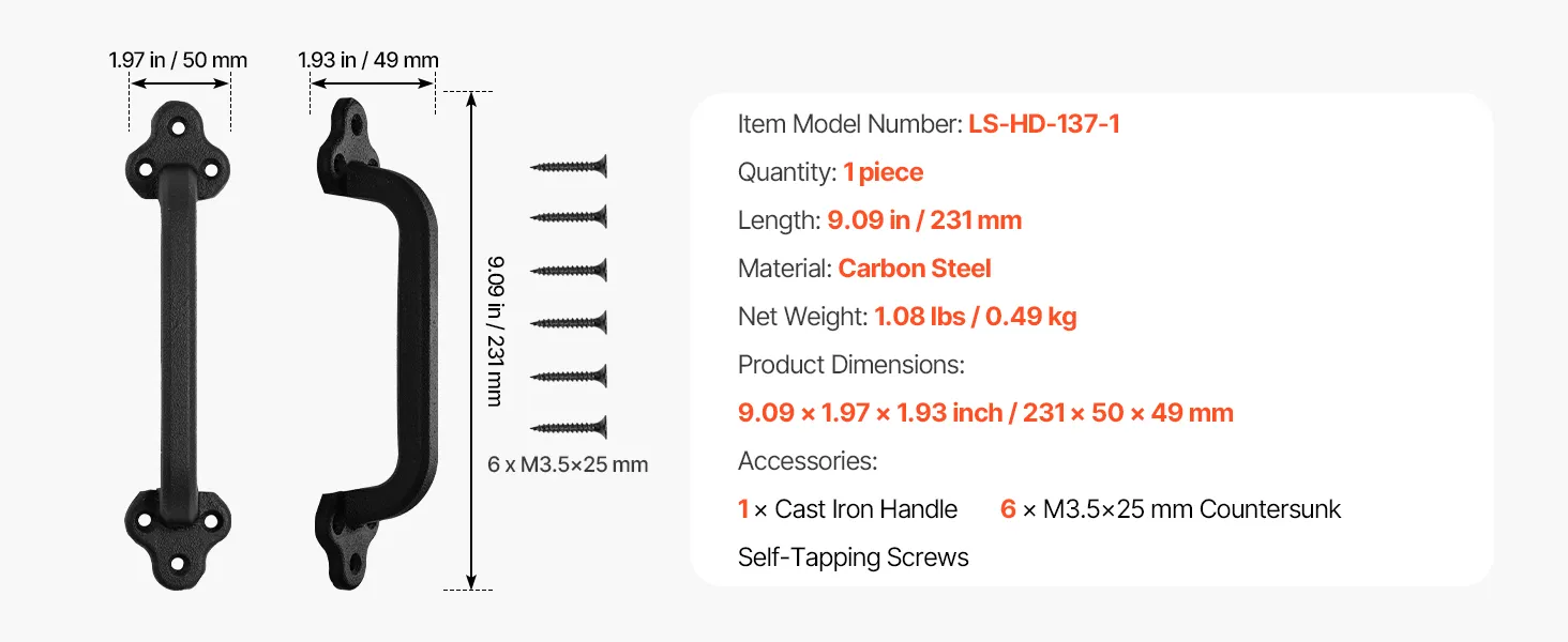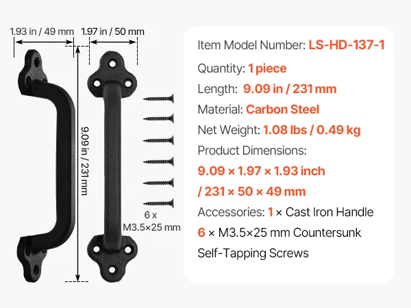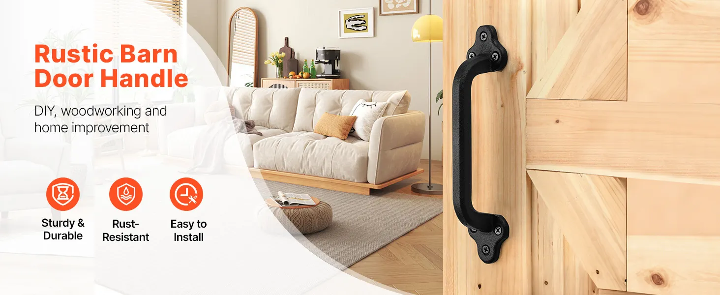 Klamka do drzwi stodołowych VEVOR, 231 mm, Klamka do drzwi stodołowych z powłoką odporną na rdzę, Klamka do drzwi przesuwnych ze stali węglowej, Uchwyt do szafki, Metalowe klamki do drzwi przesuwnych do garażu, szopy, szafy