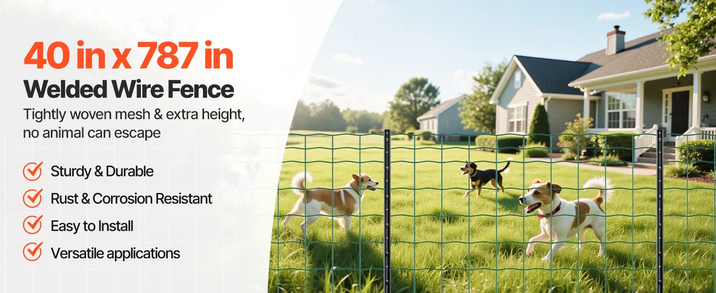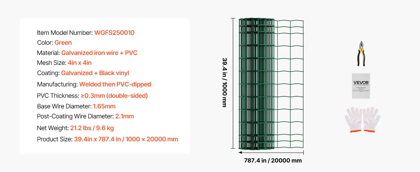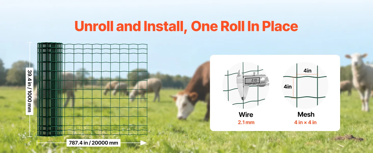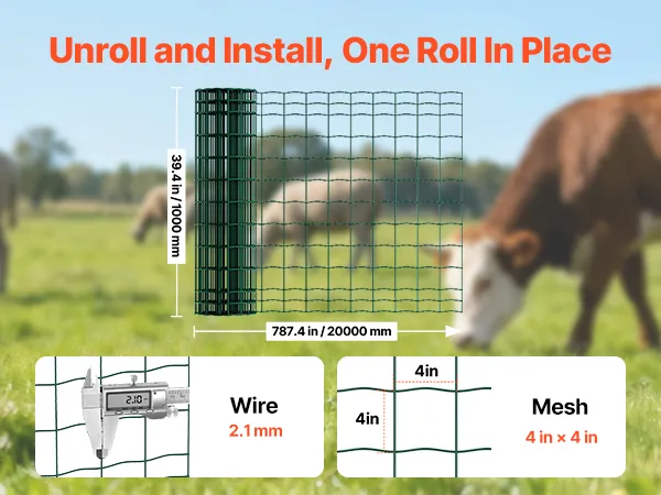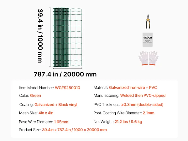 Ogrodzenie ogrodowe VEVOR, 1 x 20 m, siatka druciana (2,1 mm), ocynkowane ogrodzenie z drutu stalowego dla bydła, świń i owiec, ogrodzenie dla zwierząt hodowlanych pokryte winylem do wybiegów dla zwierząt, siatka klatkowa, ogrodzenia ogrodowe, zielone